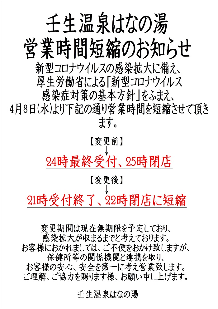 館内施設営業時間短縮、ロウリュ中止(2020年4月7日(火)時点)